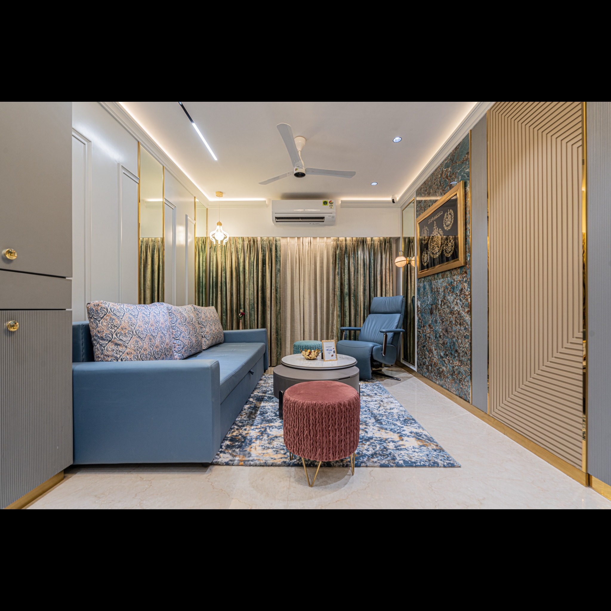 Designed for modern urban living, this elegant living room blends comfort with refined aesthetics. The soft blue sofa paired with textured cushions creates a calming yet stylish seating area, perfectly complemented by the plush accent chair for added sophistication. The statement accent wall with rich textures and gold detailing adds depth and a luxurious touch, becoming the visual highlight of the space. Subtle wall paneling and sleek finishes enhance the overall elegance while maintaining a clean, modern look. A layered lighting setup with warm cove lights and designer fixtures creates a cozy and inviting ambience. The chic center table and accent ottoman add both functionality and style, completing the space with a balanced, premium feel. A perfect mix of comfort, luxury, and smart design—ideal for homes in Kurla, Thane, and Byculla. Living Room Interior Design Kurla | Modern Living Room Thane | Luxury Interiors Byculla | Contemporary Home Design Mumbai | Premium Living Spaces | Interior Designers Kurla Thane Byculla | Stylish Home Interiors | Smart Space Planning Mumbai | Elegant Living Room Design | Modern Urban Homes