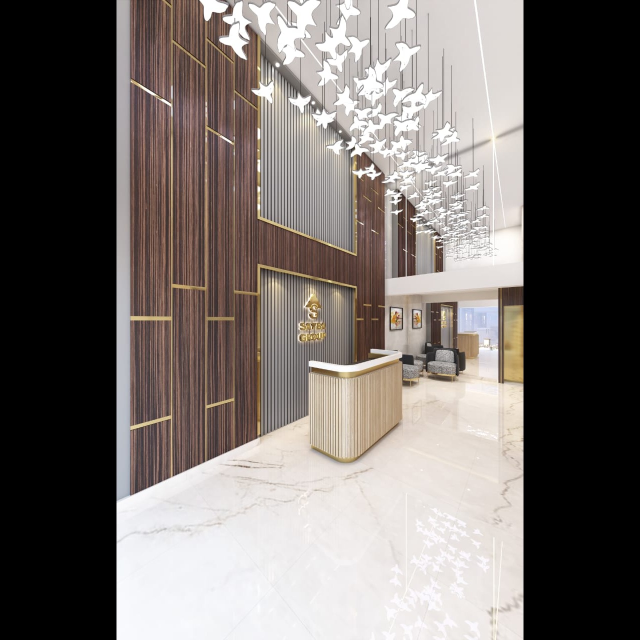 This double-height lobby for Sayba Group is crafted with a harmonious blend of rich wooden textures, vertical metallic panels, and elegant gold inlays — creating a sophisticated visual rhythm throughout the space.