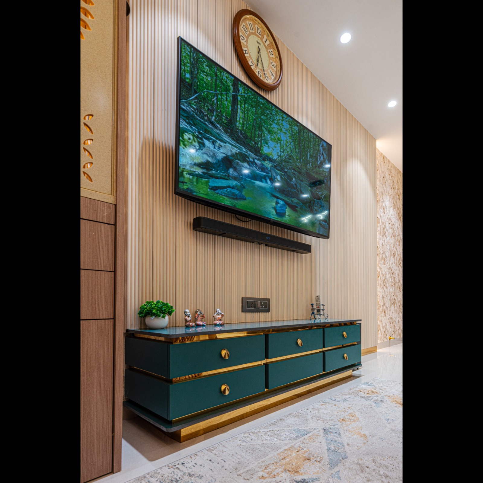 The wall-mounted TV is paired with a sleek floating console finished in a rich teal tone with brass detailing. The handle-less drawers provide ample concealed storage while maintaining a clean and clutter-free appearance. The polished stone top adds durability and a premium finish.