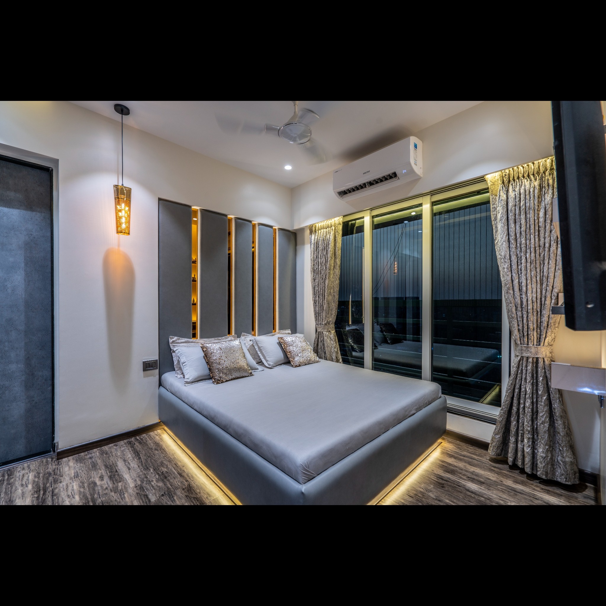 Crafted to reflect modern luxury and comfort, this contemporary bedroom in Thane features a striking upholstered accent wall with vertical panel detailing and warm backlighting. The soft textures combined with subtle gold highlights create a refined and inviting ambiance.